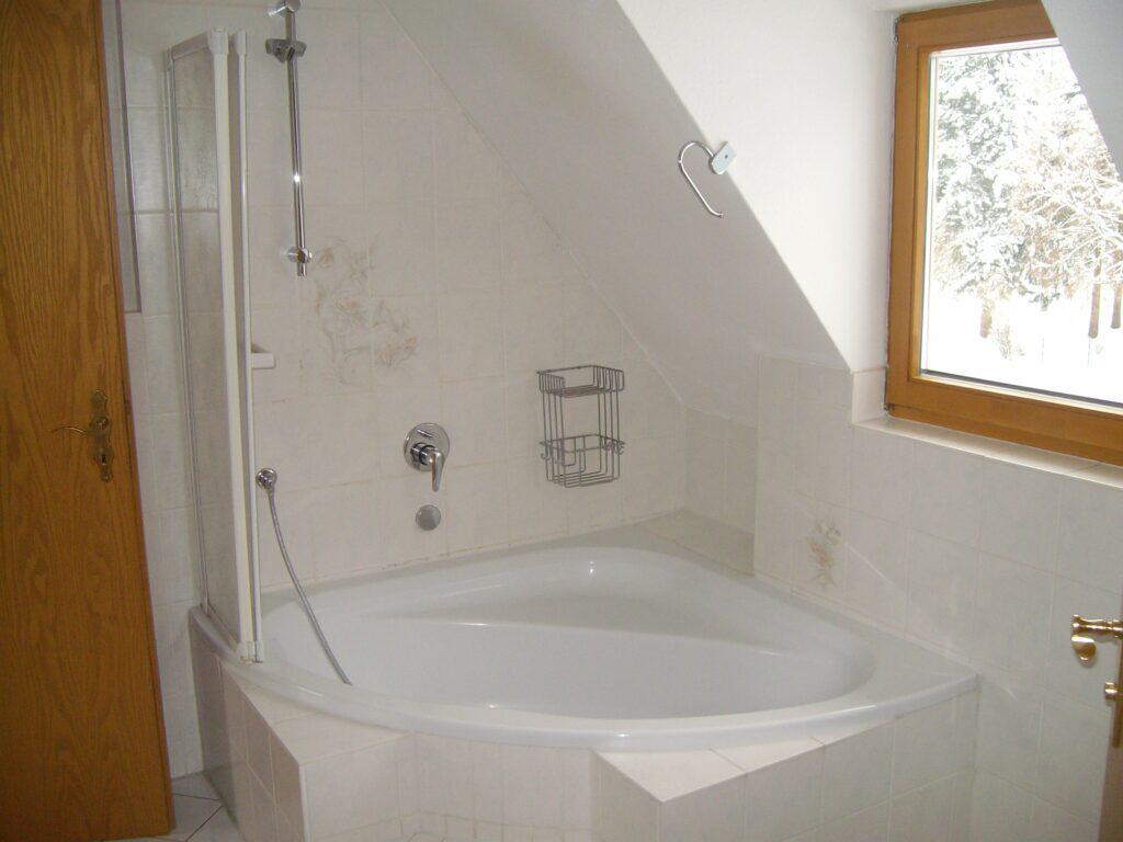 Das Badezimmer ist wandhoch hell gefliest und mit einer komfortablen Eckbadewanne inklusive Duschvorrichtung ausgestattet.