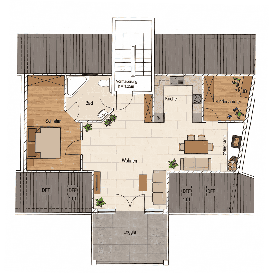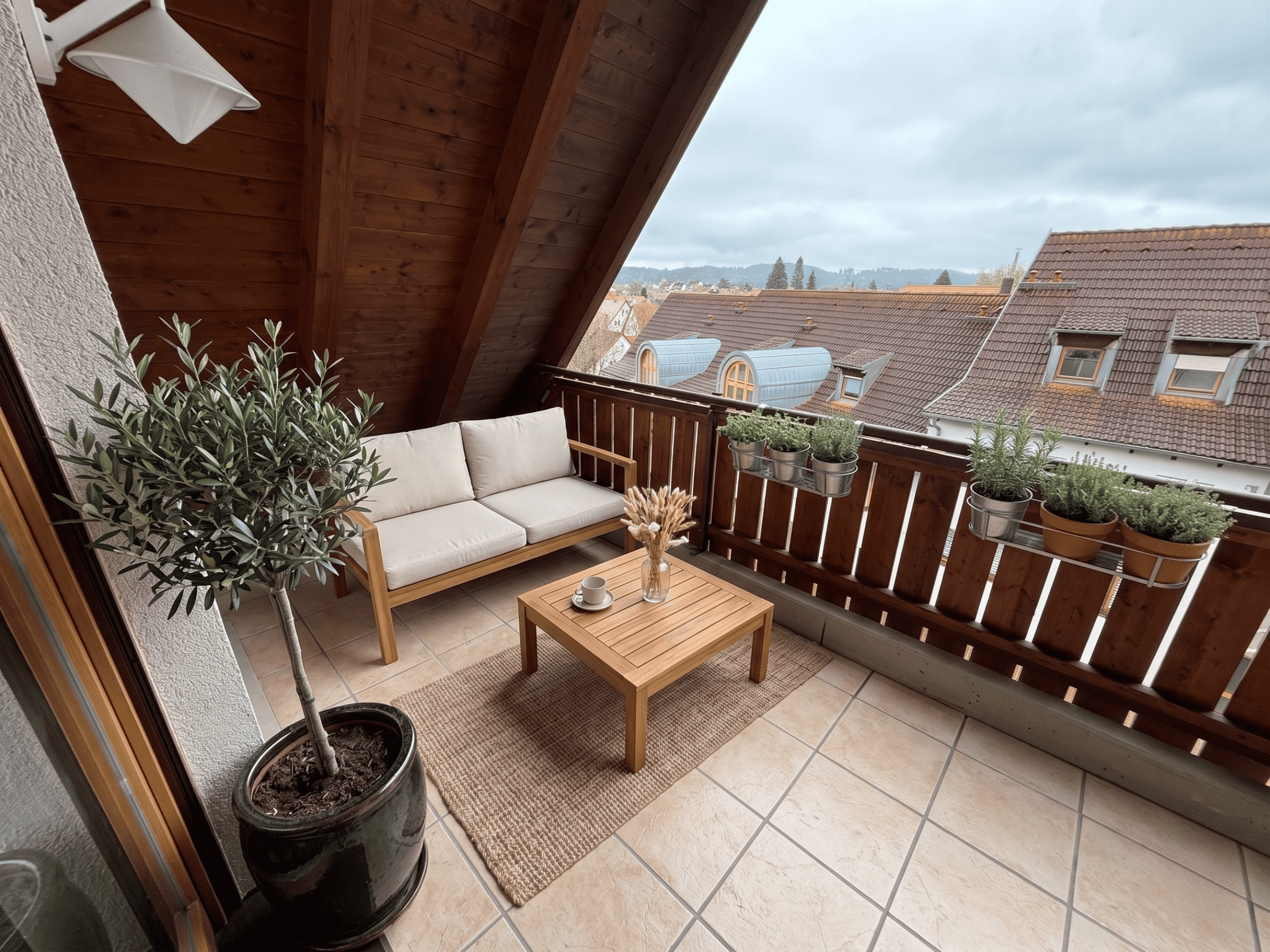 Vom Wohnbereich aus gelangen Sie direkt auf die etwa 7,5 m² große, überdachte Loggia, die dank ihrer geschützten Lage zu entspannten Stunden bei nahezu jedem Wetter einlädt.