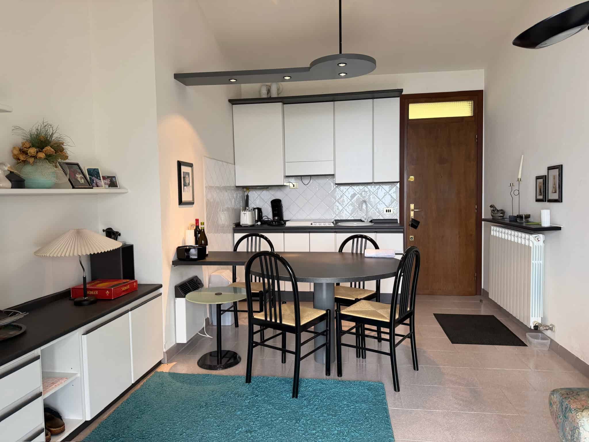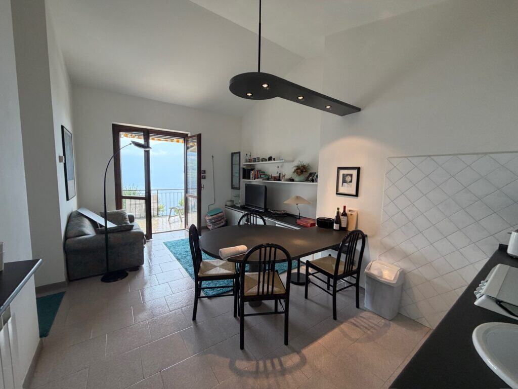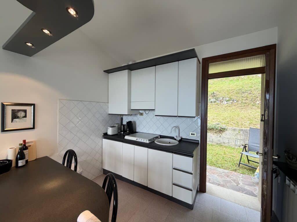 Beim Betreten der Wohnung erreichen Sie den offenen Wohn-Ess-Bereich, der mit einem bodentiefen Fenster Zugang zum Balkon sowie einen unverbaubaren Ausblick auf den Gardasee eröffnet. Die eingebaute Küchenzeile bietet alles, was Sie oder Ihre Feriengäste für einen Aufenthalt benötigen.